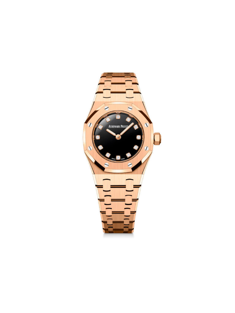 El reloj presenta un diseño bicolor contemporáneo con cristal de zafiro con tratamiento de PVD negro. Dos ventanillas con marco de oro indican los números de las horas y los minutos, que están estampados en blanco sobre negro. La firma de Audemars Piguet aparece en tonos de oro rosa a las 6 horas.