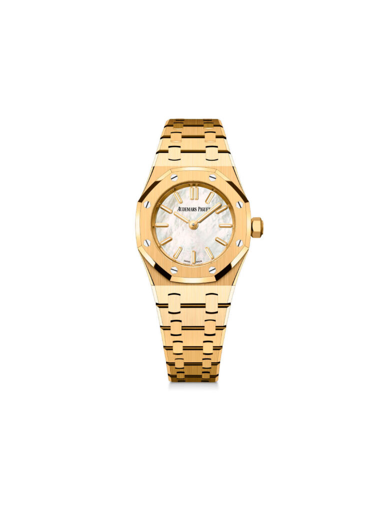 El segundo modelo cuenta con una esfera de nácar extra blanca enmarcada por una caja y un brazalete de oro amarillo de 18 kilates. Admirado por sus reflejos iridiscentes y su origen natural, el nácar ha sido históricamente muy apreciado en el sector por su asociación con la feminidad, brillo y durabilidad. El uso del nácar no es nuevo en Audemars Piguet, pero su regreso a la colección Royal Oak supone un hito importante en la celebración de este material atemporal. La combinación de oro amarillo y nácar evoca los diseños históricos del Royal Oak y, al mismo tiempo, aporta una estética fresca y luminosa.
