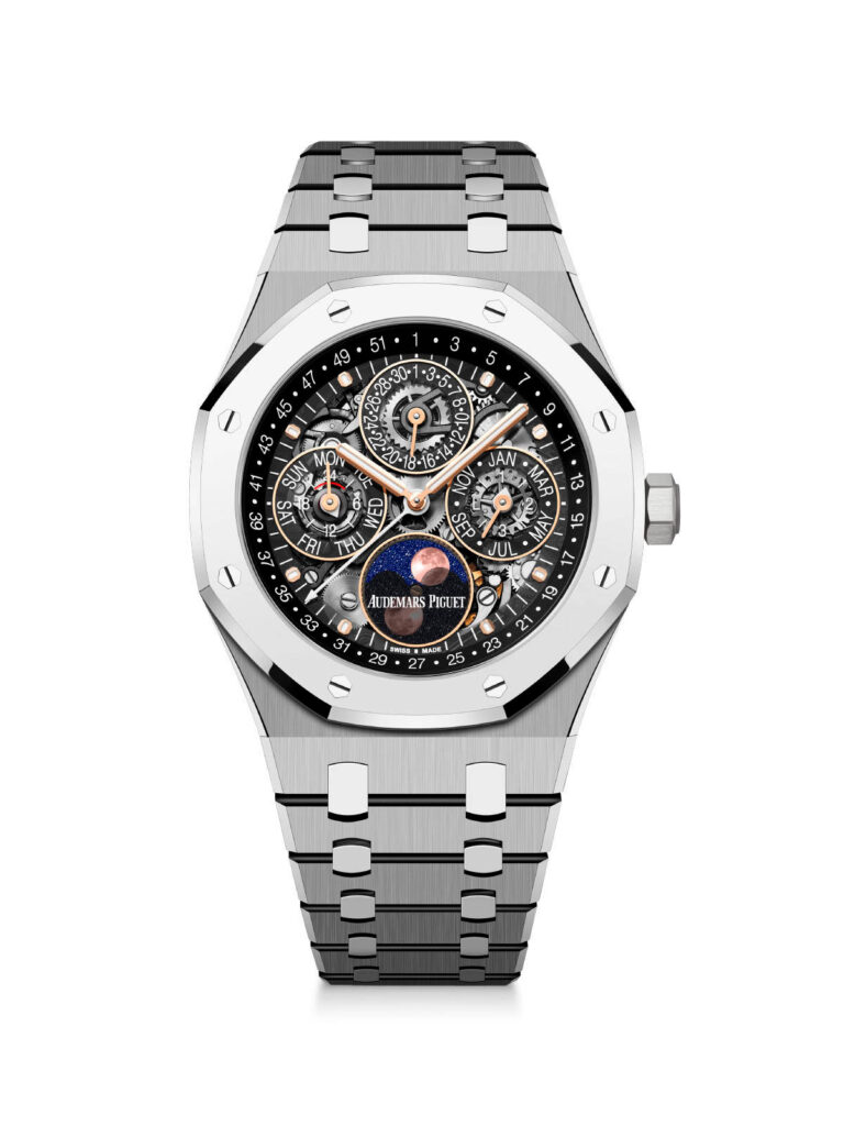 Otra de las grandes novedades desveladas ha sido el nuevo movimiento automático esqueletado con calendario perpetuo, el Calibre 7139, que ofrece una visión moderna de esta complicación clásica y la ancestral artesanía del esqueletado. Con un diseño ergonómico, incorpora el sistema de corrección intuitiva a través de la corona «todo en uno» de la marca (que se introdujo el año pasado para celebrar su 150 aniversario) y presenta una indicación del calendario armoniosa que mejora la legibilidad. Los componentes esqueletados permiten contemplar el corazón mecánico del movimiento. El Calibre 7139 se estrena en dos modelos de 41 mm: un Code 11.59 by Audemars Piguet bicolor atemporal (el primer calendario perpetuo esqueletado de la colección) y un Royal Oak de titanio y cristal metálico amorfo (BMG). Ambos relojes presentan esferas de zafiro que resaltan la artesanía y la arquitectura refinada del movimiento. Siguiendo los pasos del histórico Calibre 5135, retirado el año pasado, el Calibre 7139 abre nuevas posibilidades técnicas y estéticas para esta complicación celeste.