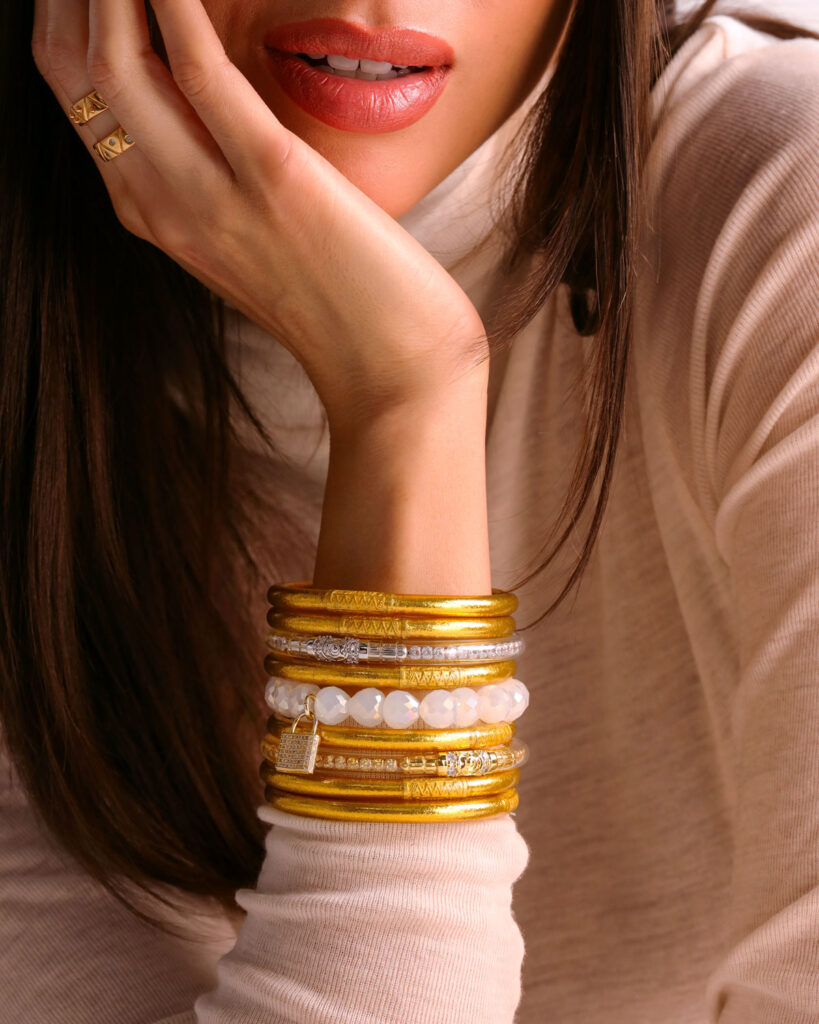 Utilizando una técnica especializada para infundir colores intensos en un tubo ligero, lujoso y aprobado por la TSA, Jessica convirtió con BuDhaGirl el antiguo arte tailandés de las pulseras rellenas de oro, antaño creadas para ceremonias, ofrendas en templos y como símbolos de prosperidad, en un ritual contemporáneo lleno de significado.