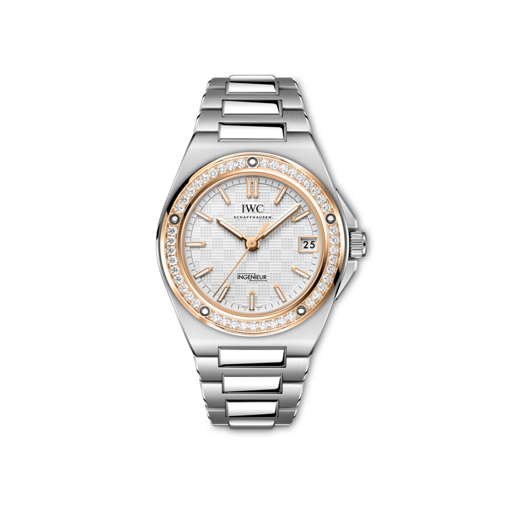 Los modelos femeninos siguen elevando su apuesta por ello, IWC Schaffhausen presenta dos nuevas versiones de su Ingenieur Automático 35 en la feria Watches and Wonders de Ginebra; uno de ellos con un bisel de oro rojo de 18 quilates adornado con 45 diamantes blancos.