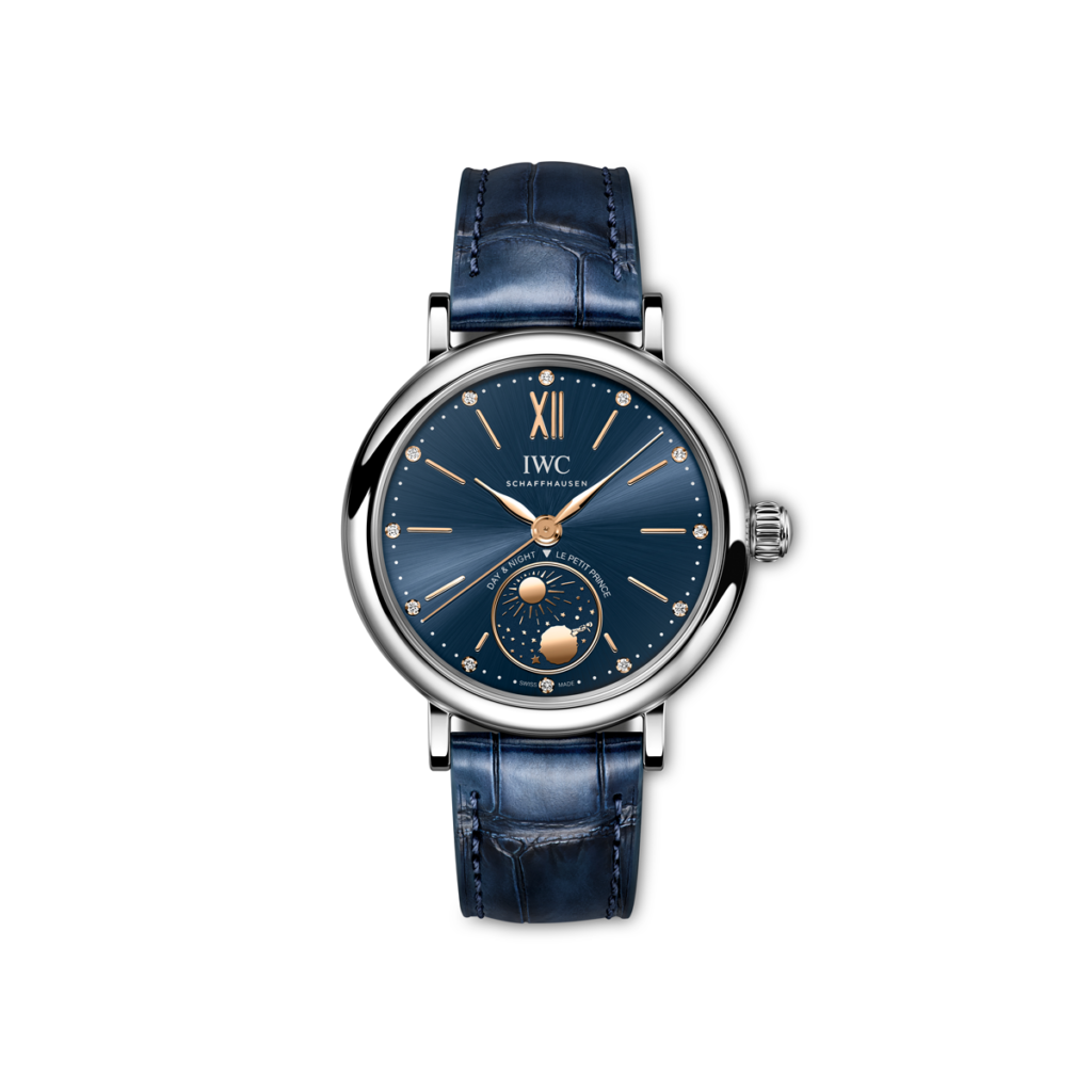 El Portofino Automático Día y Noche 34 Le Petit Prince (ref. IW459806) cuenta con una caja compacta, de 34 milímetros, fabricada en resistente acero inoxidable. El diseño de este elegante y atemporal reloj de vestir se complementa con una esfera azul profundo con agujas y apliques dorados. Estas esferas, que se tratan con un elaborado acabado de rayo de sol, son un rasgo distintivo de las ediciones especiales de IWC que homenajean el intemporal relato de Saint-Exupéry.