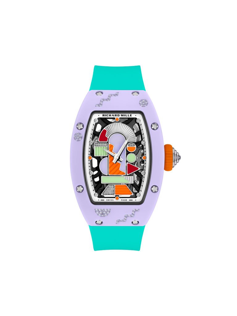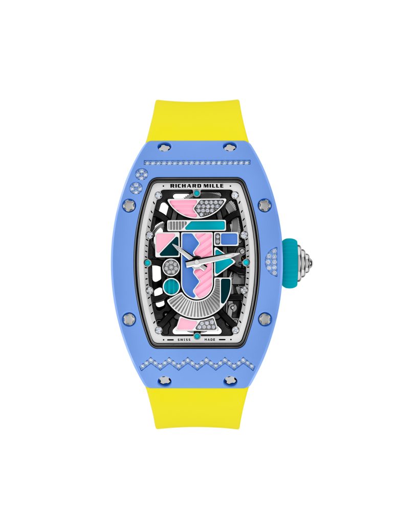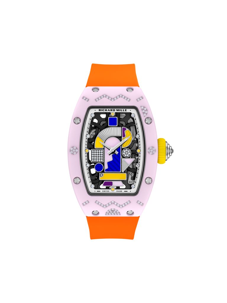 La inspiración de esta edición encuentra su origen en la efervescencia creativa de los años 80, una década definida por la libertad estética, los contrastes audaces y una aproximación inédita a los materiales. Richard Mille reinterpreta este legado a través de esferas realzadas por una pluralidad de técnicas decorativas. Como señaló Cécile Guenat, directora de Creación y Desarrollo, con motivo del lanzamiento de las dos colecciones anteriores: “Estos relojes juegan con la yuxtaposición de colores vibrantes y texturas contrastadas, afirmando una identidad gráfica singular y disruptiva“. Elaboradas en oro rojo tratado con PVD gris, las esferas integran cerámica coloreada, apliques de caucho cortados con láser y delicados engastes de diamantes sobre insertos de oro blanco.