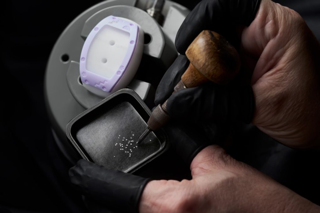 Y es que, uno de los mayores logros de esta edición reside en el engaste de los biseles, especialmente complejo debido a la dureza de la cerámica. La técnica de mitraillage exige una precisión extrema, donde cada piedra se coloca a mano con absoluta meticulosidad. Las carruras, en oro blanco pulido con pilares satinados, se enriquecen con combinaciones únicas de piedras preciosas: el modelo Blush Pink incorpora diamantes con zafiros amarillos y azules; el Powder Blue combina diamantes, zafiros rosas y tsavoritas y el Lavender Pink mezcla diamantes, zafiros naranjas y rubíes. Cada composición aporta una identidad cromática propia, reforzando el carácter exclusivo de cada pieza mientras que cada tonalidad se materializa en cerámica TZP, un material de alto rendimiento conocido por su resistencia, estabilidad y capacidad de conservar la intensidad cromática con el paso del tiempo.
