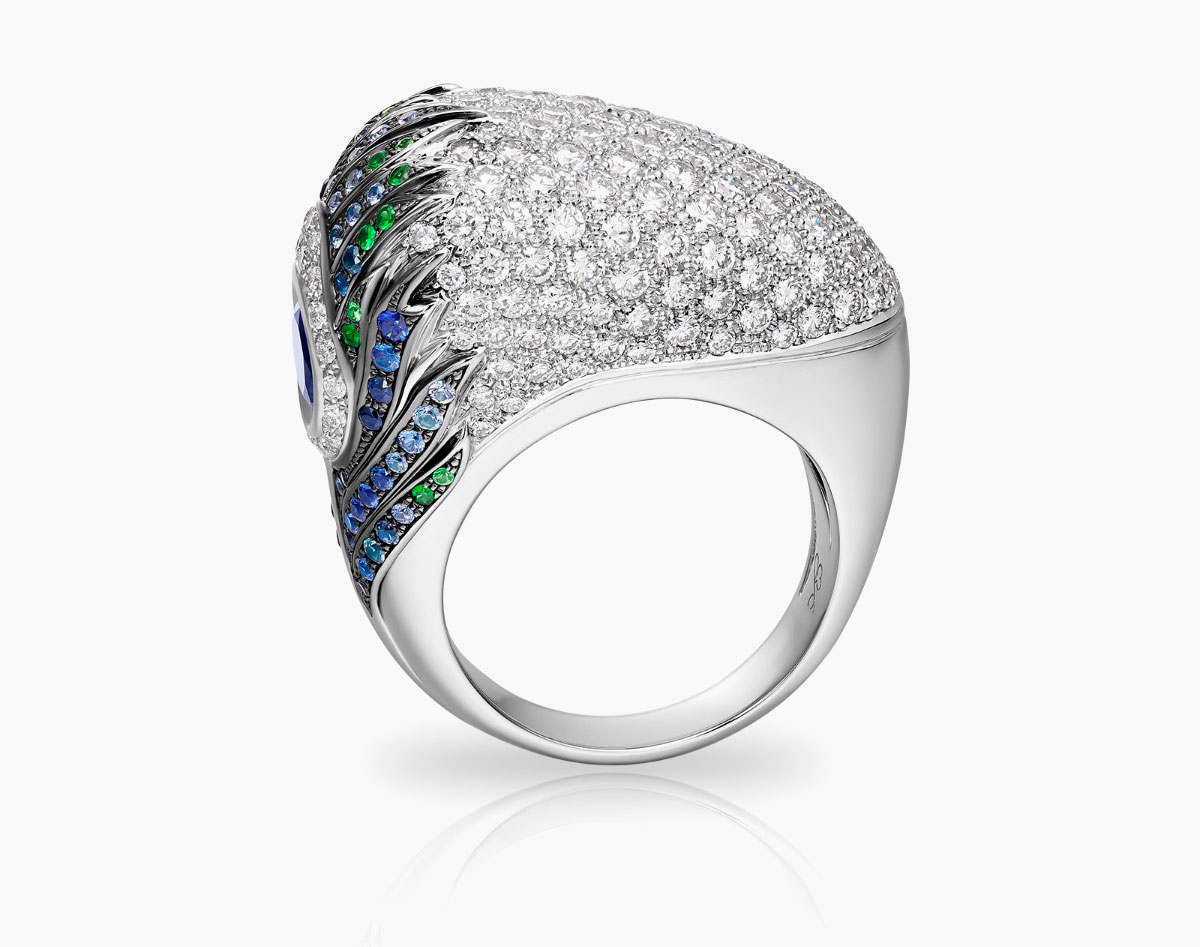 Anillo Carnaval. Anillo de oro blanco de 18 quilates, perteneciente a la colección Peackock, con 163 diamantes, 14 granates, 63 zafiros y 1 iolita.
