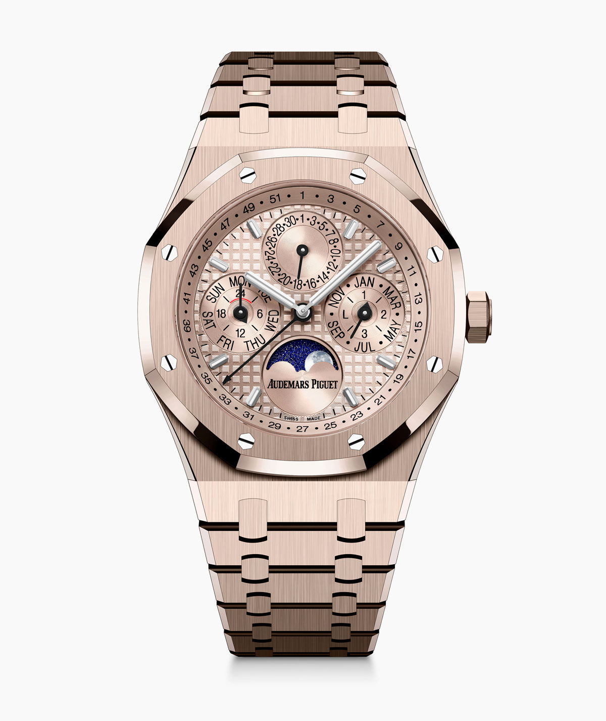 Con el nuevo Calibre 7138, toda una proeza relojera protegida con 5 patentes, el Royal Oak Calendario Perpetuo Automático aúna complejidad mecánica y máxima ergonomía. Gracias a su innovadora corona todo en uno, todos los ajustes se pueden realizar fácilmente sin necesidad de herramientas adicionales ni riesgo de daños. Fundamentado en las innovaciones del Calibre 5133, lanzado en 2018, este nuevo movimiento integra todas las funciones de calendario perpetuo en un solo nivel y visualiza automáticamente la fecha correcta, incluso en los años bisiestos. La esfera y los contadores también se han reorganizado a fin de mejorar su legibilidad, simetría y armonía visual.