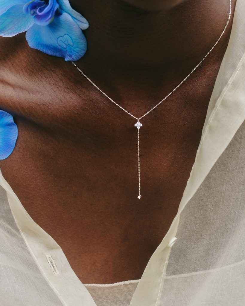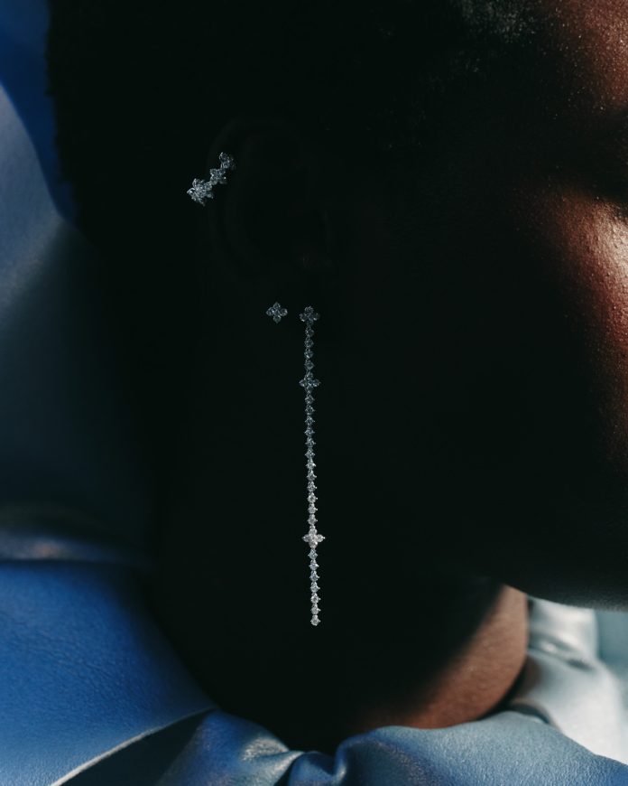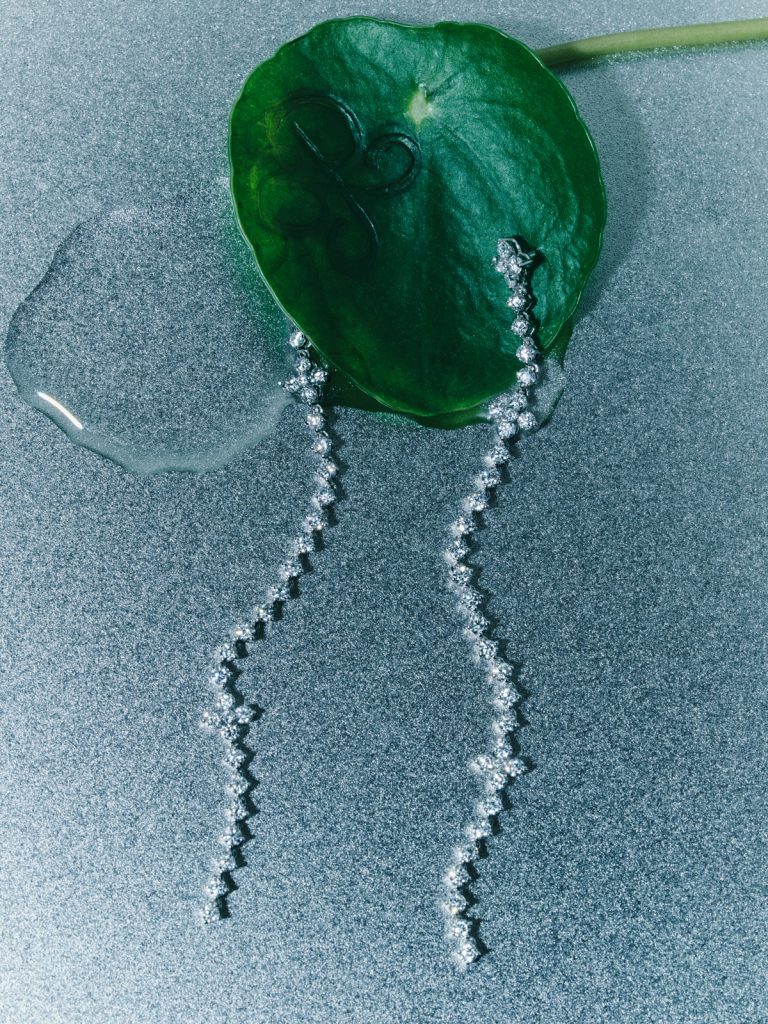 La colección está elaborada en oro blanco de 18 quilates con baño de rodio y diamantes de laboratorio, reflejando un enfoque contemporáneo que combina lujo y sostenibilidad. Aunque la verdadera innovación está en la ligereza: piezas con presencia y carácter que se sienten naturales y fáciles de llevar. El trabajo del oro permite mantener el volumen sin añadir peso, logrando piezas ligeras que se adaptan de forma natural al cuerpo y, en el corazón de cada flor, un diamante central ligeramente elevado genera un efecto flotante y luminoso, uno de los detalles más característicos de la Alta Joyería de PDPAOLA.