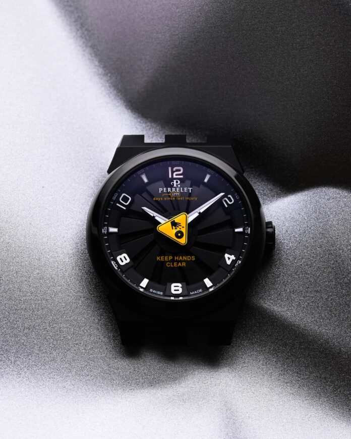 El artista seconde/seconde/, juega con la turbina, resaltando su potencial. Ha sustituido la tradicional aguja central de los segundos por el clásico signo “Keep Hands Clear”, utilizado para evitar accidentes en presencia de maquinaria en movimiento o componentes con bordes afilados. Además, ha utilizado la fecha de fundación de la Maison para componer la inscripción “1777 days since last injury”, una clara referencia al típico cartel “Safety First” que se encuentra en las fábricas anglosajonas. Un signo que indica el número de días sin accidentes, precisamente para demostrar la seguridad en el lugar de trabajo.