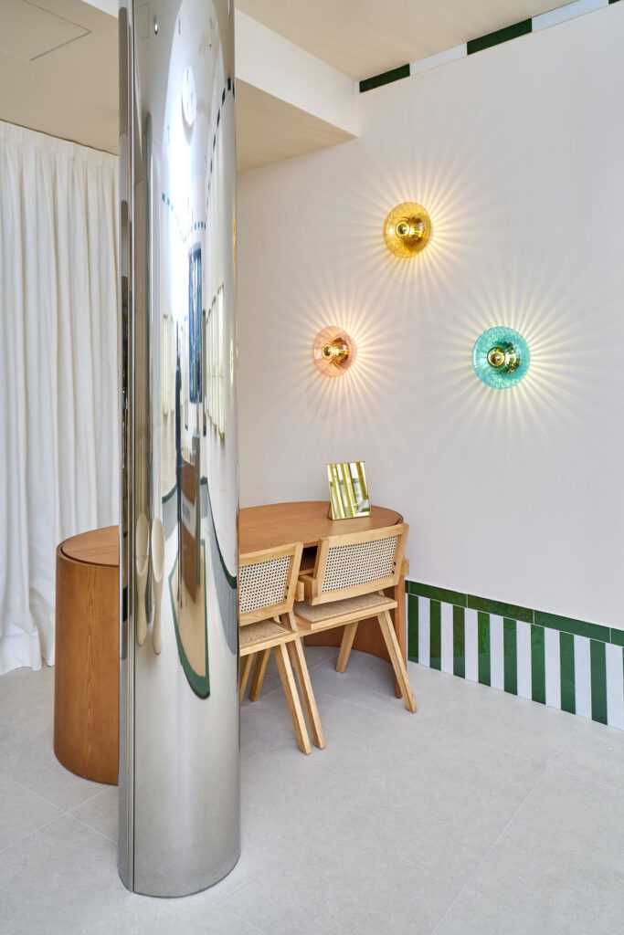 La identidad de Sophie d’Agon se integra de manera sutil en el espacio, con un logotipo elegante que refuerza su posicionamiento de lujo sin perder su elegancia discreta, característica de la firma. Un lugar sencillo pero elegante que honra los materiales, donde cada detalle contribuye a una experiencia envolvente y refinada. La luz natural que inunda la boutique resalta la sensación de serenidad y bienestar.